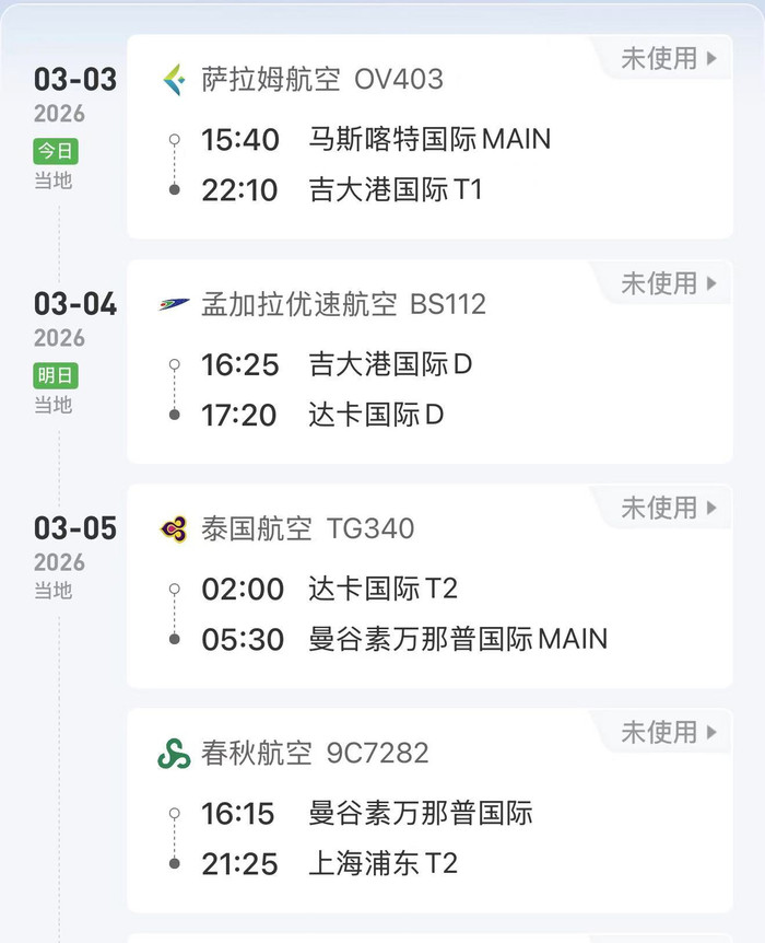 但最怕突如其来的变故。3月2日,邓野收到通知,飞往孟买的航班不知为何被取消,她不得不重新规划路线。最终,她又购买了3月3日由阿曼飞往印度达卡的航班。